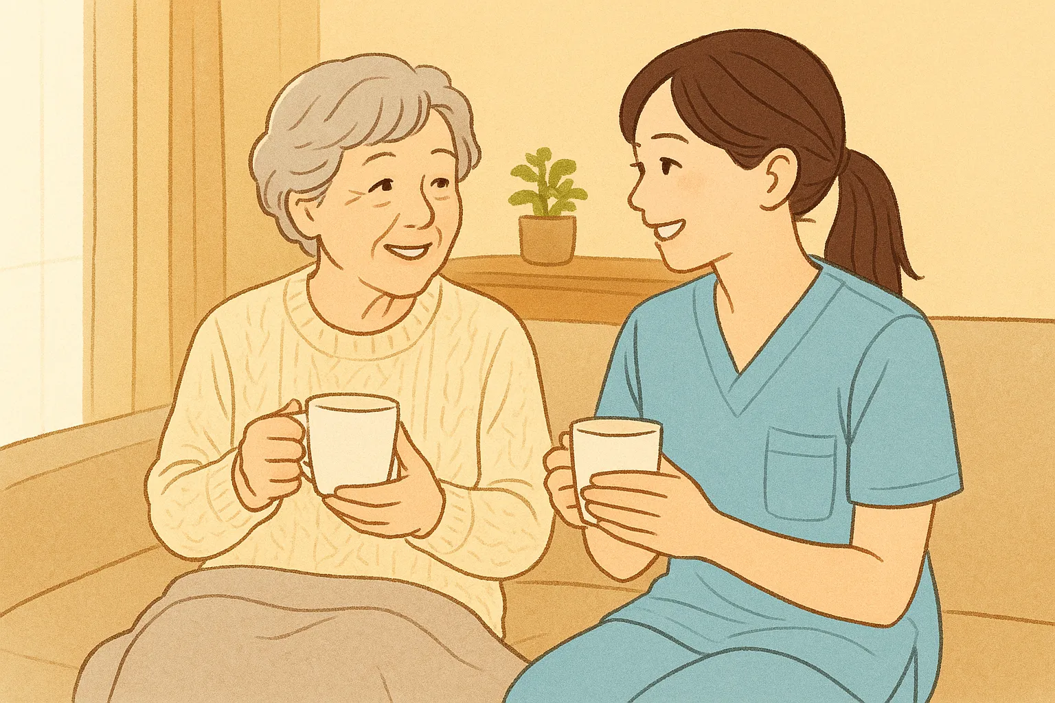 温かい飲み物を少しずつ飲んだり、ひざ掛け・レッグウォーマーで体の中心を冷やさないようにするのがおすすめです🍵